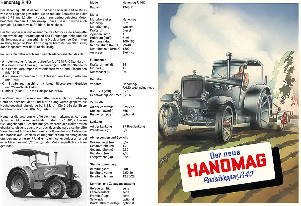 Von Oktober 1945 bis September 1946 wurden bei der Hanomag 1.439 Schlepper vom Typ R 40 hergestellt. Der Schlepper R 40 war die Weiterentwicklung des R 38. Die eigentliche Neuerung dabei war das mit der Firma Famo in Breslau, entwickelte 5-Gang-Getriebe. Die Äußere Form des R 40 wurde stark an das Design des Bauernschleppers RL 20 angelehnt.